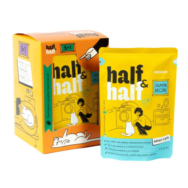 Набір вологих кормів Half&Half "5+1" для дорослих котів, шматочки з лососем у желе, паучі, 6 шт*100 г