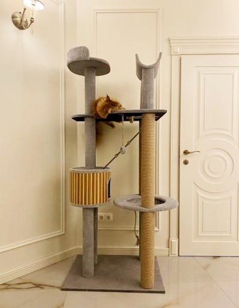 Стильний ігровий котячий комплекс кігтеточка з будиночком лежанками для котів середніх порід 190х80х60см сірий