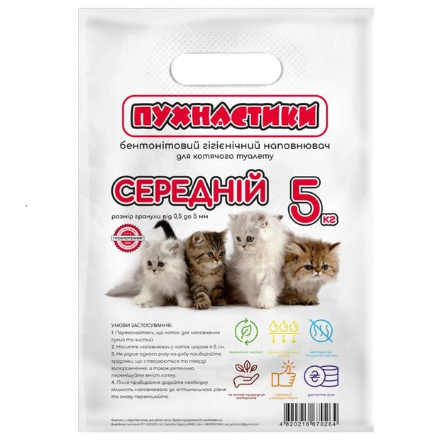 Бентонітовий наповнювач Пухнастики для котячого туалету, середній без аромату 5 кг