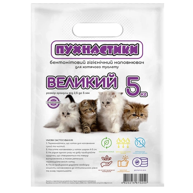 Наповнювач Пухнастики для котячого туалету великий без аромату 5 кг (4820216670240)