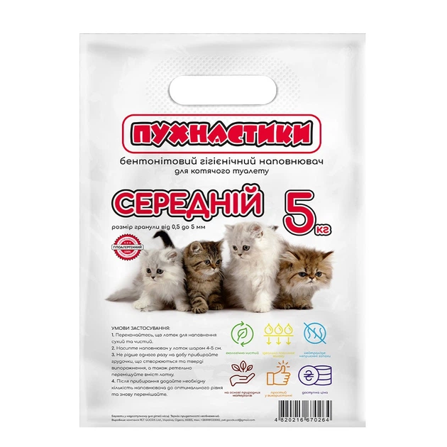 Наповнювач для котячого туалету Пухнастики бентонітовий середній без аромату 5 кг