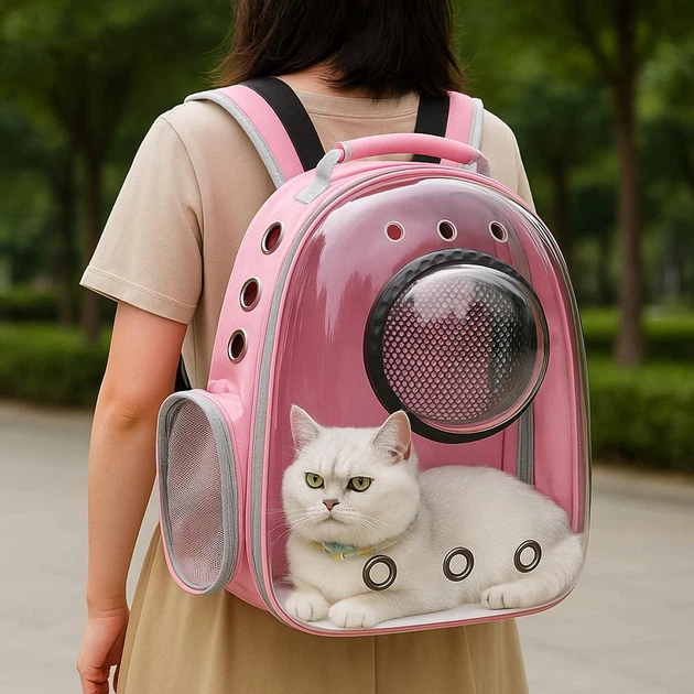 Рюкзак переноска для кота з віконцем та прозорою стінкою, 42x35x22 см, Рожевий (Переноска для тварин)