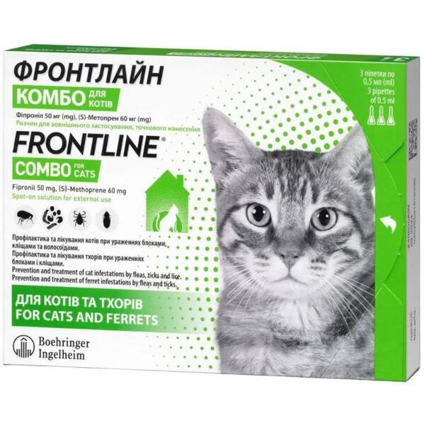 Краплі Frontline Combo - посилений захист проти зовнішніх паразитів для, котів та тхорів. Коти Профілактика та лікування котів при ураженнях блохами, кліщами та волосоїдами. Тхори Профілактика та лікування тхорів при ураженнях блохами, кліщами, а також з метою запобігання прикріплення та розвитку ектопаразитів. Особливості: Блокує розвиток незрілих стадій бліх до 6 тижнів При комплексному лікуванні блошиного алергічного дерматиту.