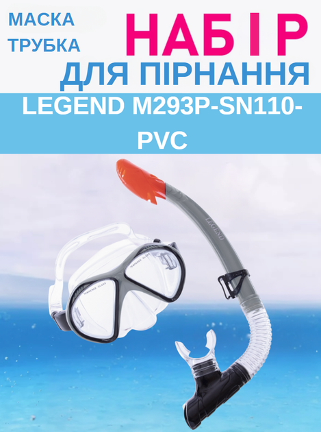 Набір для плавання маска з трубкою LEGEND M293P-SN110-PVC (термоскло, PVC, пластик, чорно-сіро-прозорий)