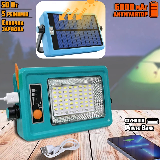 Світлодіодний ліхтар - прожектор на сонячній батареї Solar Light-50W 6000мАч, індикатор заряду, регулювання нахилу