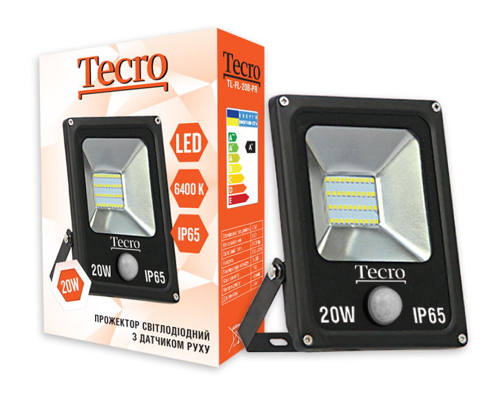 Прожектор LED, Tecro, 20W, 6400K, Black, 1400Lm, 160º, IP65, кабель із заземленням (TL-FL-20B-PR) з датчиком руху 8м TL-FL-2