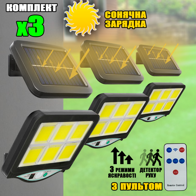 Комплект вуличний ліхтар на сонячній батареї 3 шт Solors IP65 світильник з датчиком руху та пультом, вологозахищений