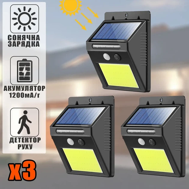 Комплект 3 штуки Вуличний світильник на сонячній батареї Solar Wall Light 6ВТ-120° безпровідний ліхтар з датчиком руху
