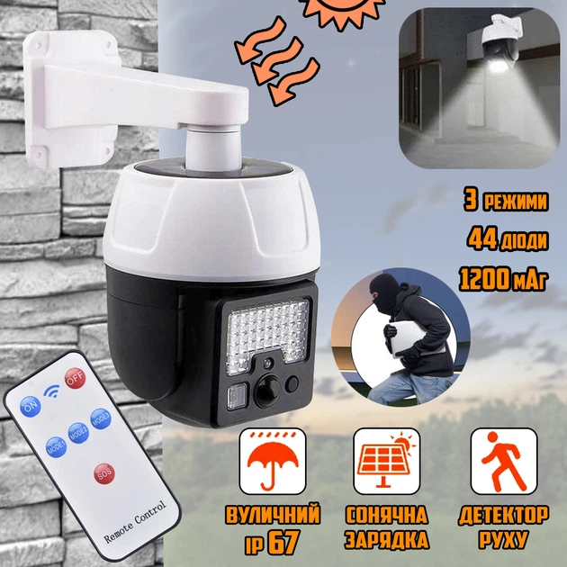 Вуличний ліхтар-камера обманка Solar IP66-1200mAh із сонячною панеллю та пультом -120° вологозахищений, датчик руху