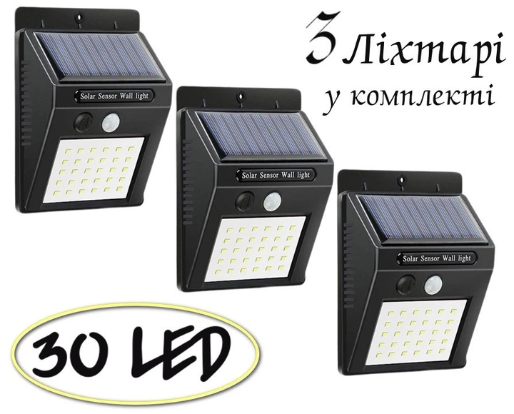 Ліхтар на сонячній батареї з датчиком руху SOLAR 30 LED 3 штуки в комплекті