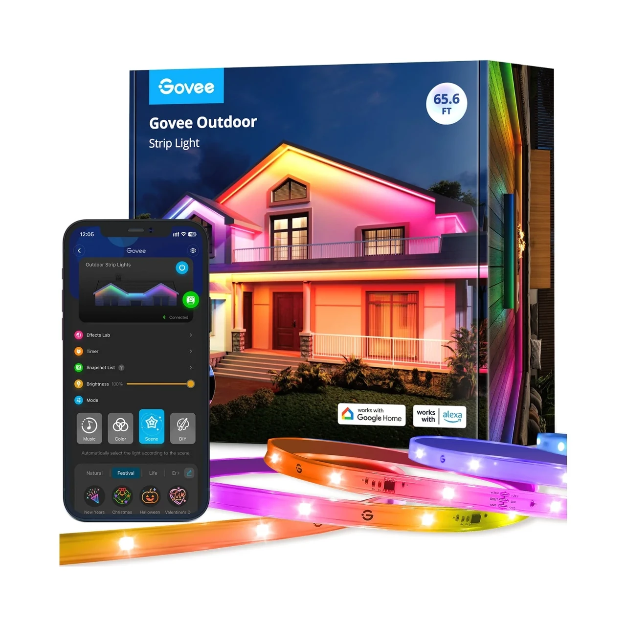 Освети яркими цветами свой двор Govee Wi-Fi RGBIC 20м Интеллектуальное голосовое управление Благодаря интеллектуальному голосовому управлению вы можете получить доступ к своему освещению, не используя рук. Подключите уличные светодиодные фонари к Alexa и Google Assistant, чтобы настроить цвета, яркость и многое другое. Цвет сегмента RGB IC Создайте освещение, уникальное для вашего
