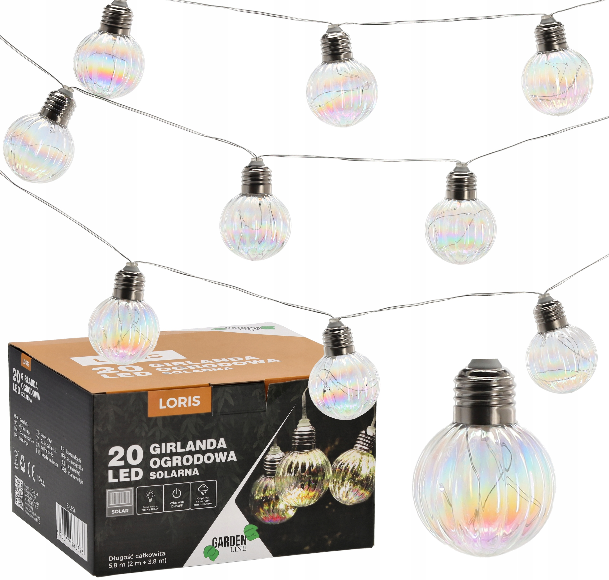 - Тип товару Садова світлодіодна гірлянда - Загальна довжина 5,8 м (2 м + 3,8 м) - LED лампи 20 шт, холодний білий - Відстань між лампочками 0,2 м - Живлення 1,2 В 600 мАг NI-MH - Ступінь захисту IP44 (водонепроникний) - Час зарядки 7-8 год - Час роботи 6-7 год