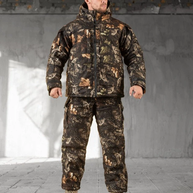 Зимовий Чоловічий Костюм KMS алова на флісі та синтепоні / Бушлат з капюшоном + Штани leaves камуфляжний розмір XL