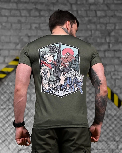 Тактична футболка Girl Олива з матеріалу Coolmax з потовідвідними властивостями та принтом DTF XXL