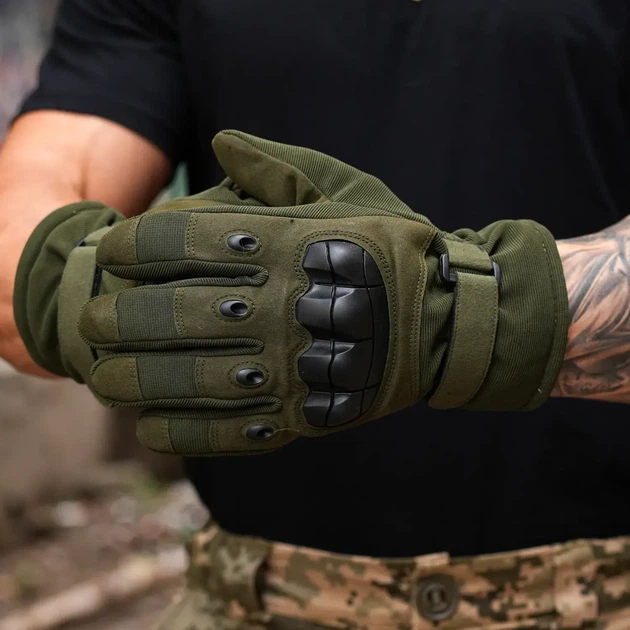 Тактичні зимові рукавички M водонепроникні утеплені на хутрі повнопалі штурмові оливковий мікрофібра синтетична шкіра до -20