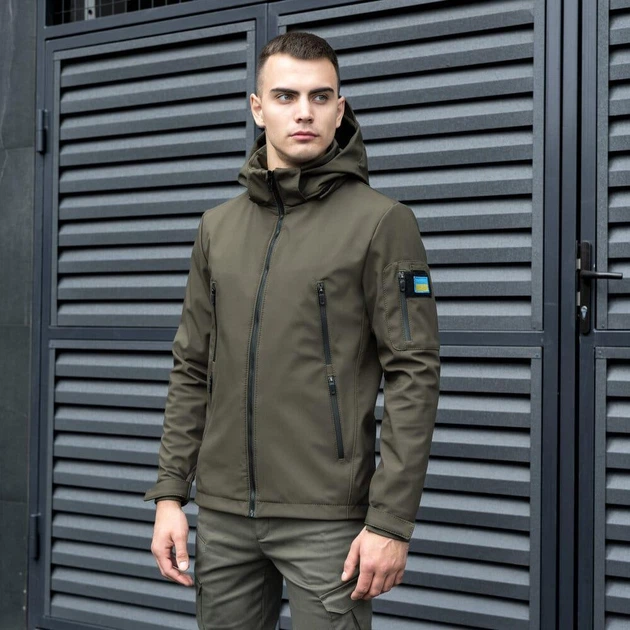 Куртка з капюшоном Pobedov Motive SoftShell олива + шеврон Прапор України розмір L