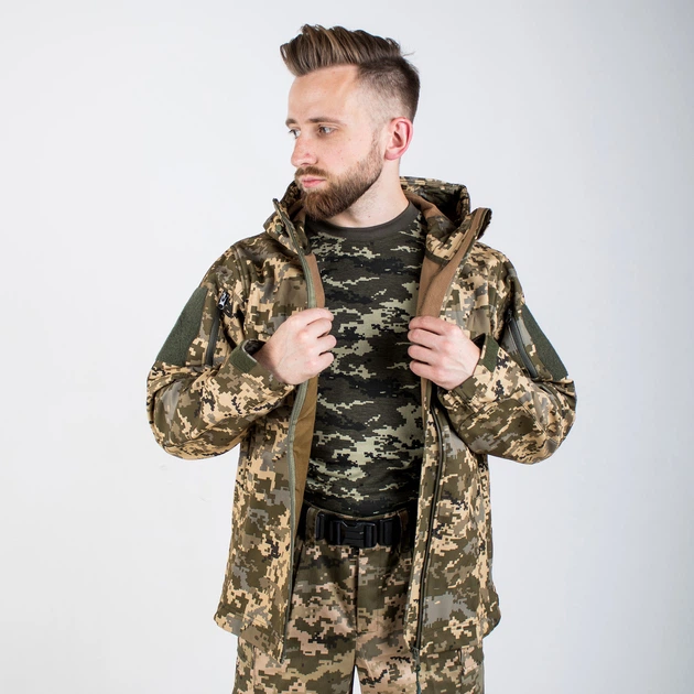 Чоловіча Куртка SoftShell з капюшоном та липучками під шеврони піксель розмір XL