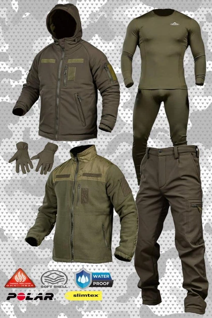 Зимовий тактичний костюм Neptun 5в1 Олива комплект куртка штани флісова кофта термо рукавички M