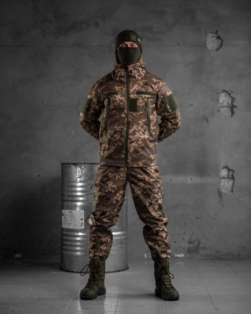 Тактичний костюм софтшелл Aura Піксель з безліччю кишень та затяжками на поясі і капюшоні XXL