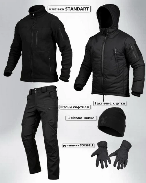 Зимовий тактичний костюм 5в1 Black комплект куртка флісова кофта штани шапка рукавички SoftShell XL