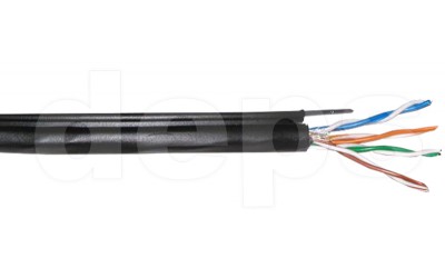 Кабель мережевий вита пара UTP неекранований категорії 5e, з несучим дротом, для зовнішнього прокладання; для створення мереж 100/1000 Мбіт/с; 4 пари жил, діаметр 0.51 мм; матеріал провідника біметал ССA – алюмінієвий сплав покритий міддю; ізоляція провідників поліетилен; зовнішня оболонка LDPE (поліетилен низької щільності) чорного кольору; максимальна частота сигналу 100 МГц; опір кабелю 27-28 Ом; довжина бухти 305 м