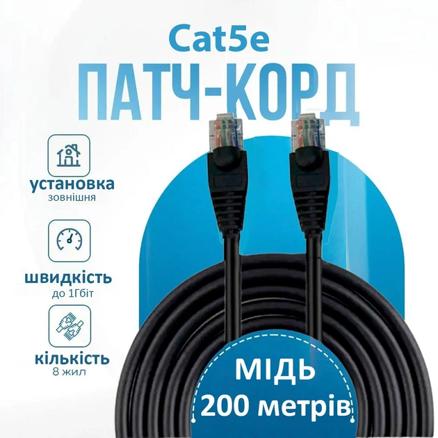 Патч корд інтернет кабель 200м зовнішній Cat5e RJ-45 мідь швидкість 1Гбіт чорний (88065sk)