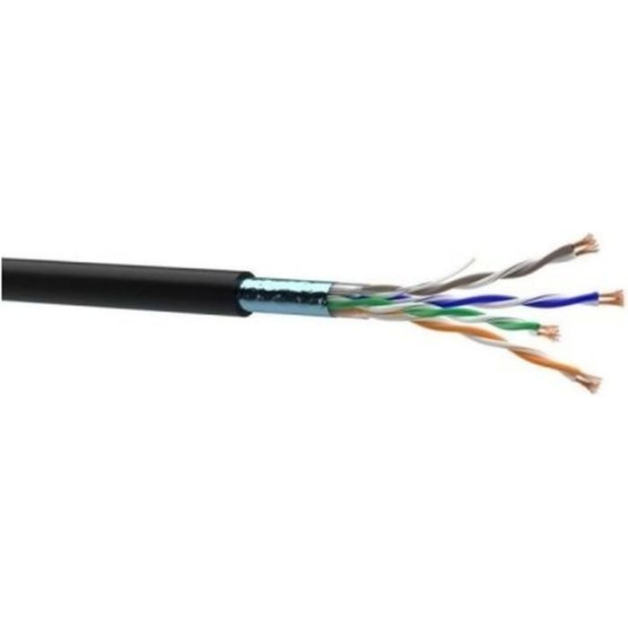 Кабель мережевий вита пара FTP екранований категорії 5e, з багатожильним дротом 7x0.45 мм, для зовнішнього прокладання; для створення мереж 100/1000 Мбіт/сек; 4 пари жил, діаметр 0.5 мм; матеріал провідника мідь; ізоляція провідників поліетилен; зовнішня оболонка LDPE (поліетилен низької щільності) чорного кольору; максимальна частота сигналу 100 мГц; опір кабелю 27-28 Ом; довжина бухти 305 м
