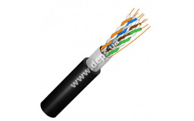 Кабель мережевий вита пара FTP екранований категорії 5e, з багатожильним дротом 7x0.45 мм, для зовнішнього прокладання; для створення мереж 100/1000 Мбіт/сек; 4 пари жил, діаметр 0.5 мм; матеріал провідника мідь; ізоляція провідників поліетилен; зовнішня оболонка LDPE (поліетилен низької щільності) чорного кольору; максимальна частота сигналу 100 мГц; опір кабелю 27-28 Ом; довжина бухти 305 м