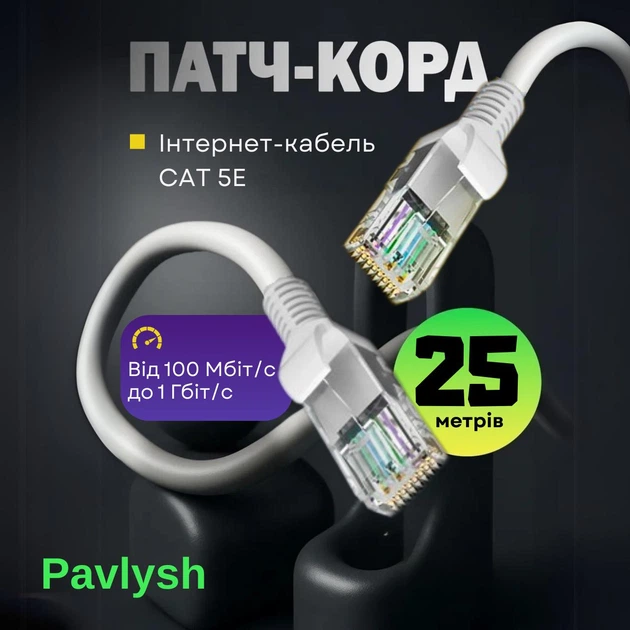 Патч корд CAT5e 25 м LAN UTP мережевий кабель для інтернету (Gigabit RJ45 Ethernet, 1 Гбіт/с) Pavlysh PK-5E25WH