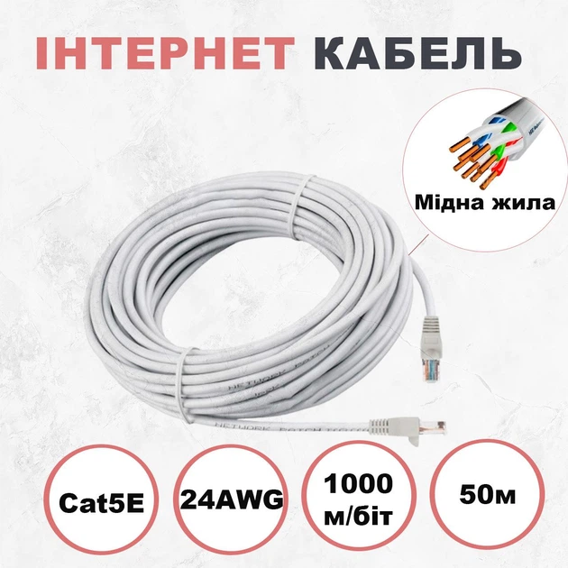 Мережевий мідний патч корд Kabelist 50м U/UTP Cat5e 24AWG кабель для інтернету з високою швидкістю 1000 мбіт/с (88047sk)