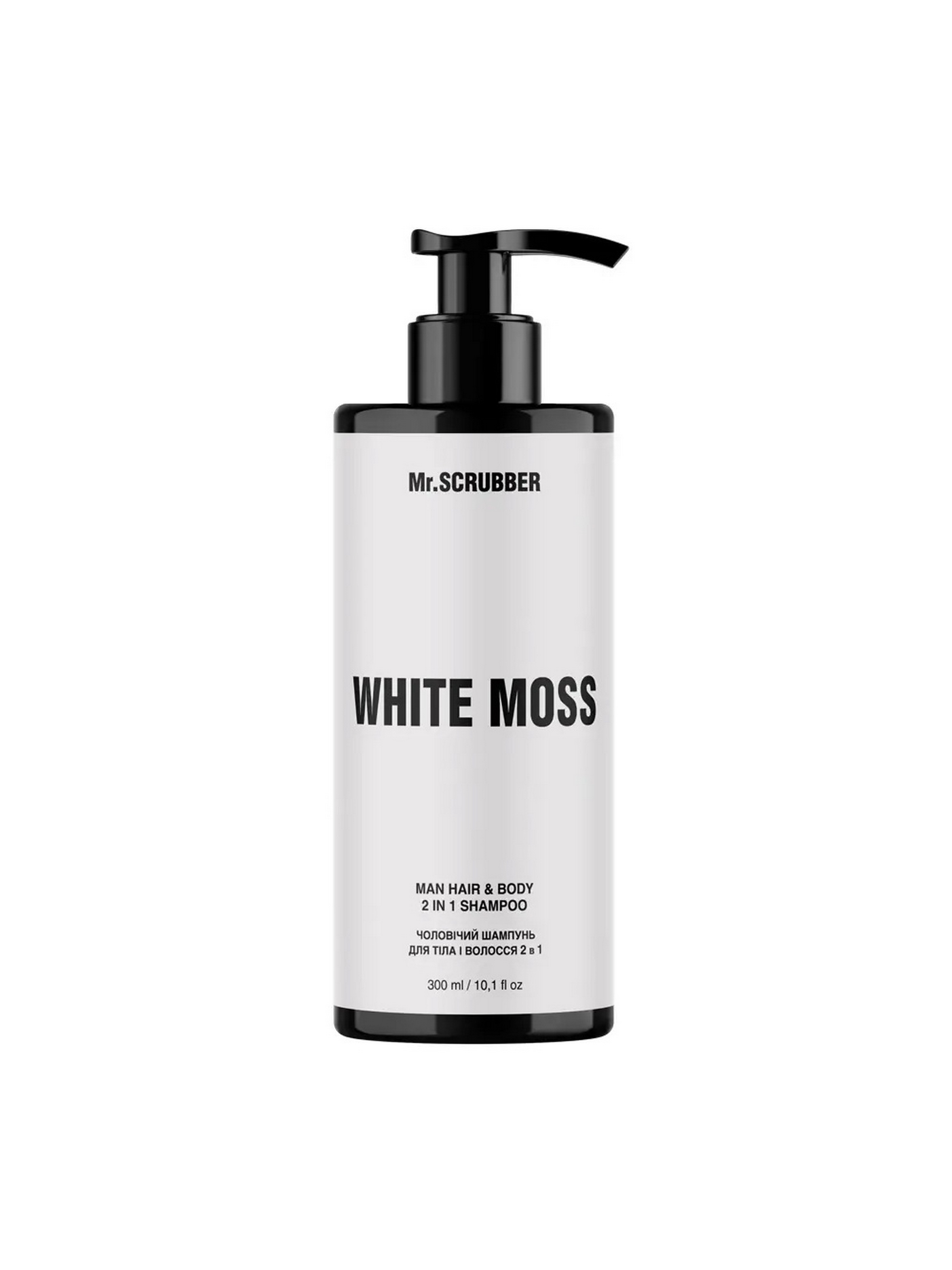 Догляд для волосся. Догляд для волосся Mr.Scrubber. • Обʼєм: 300 мл Шампунь для тіла і волосся 2 в 1 Mr.Scrubber White moss має м’який мускусний аромат з нотами моху, амбри і дерева. Він делікатно і ретельно очищує шкіру і волосся. Завдяки вмісту комплексу натуральних екстрактів усуває лущення і почервоніння, запобігає появі відчуттів сухості чи стягнутості, має м’яку дезодоруючу і дезінфікуючу