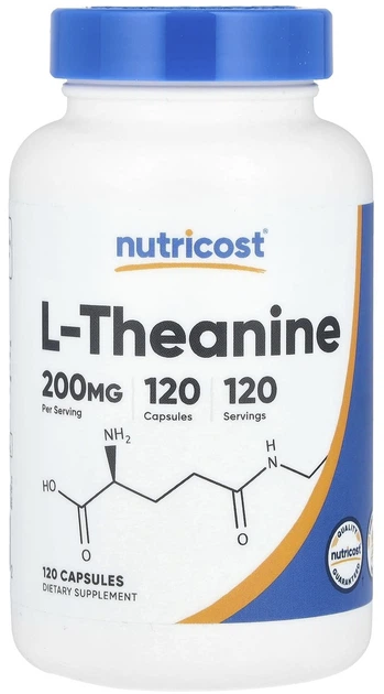 Амінокислота L-теанін, 200 мг, 120 капсул, зниження рівня стресу й тривожності, Nutricost.