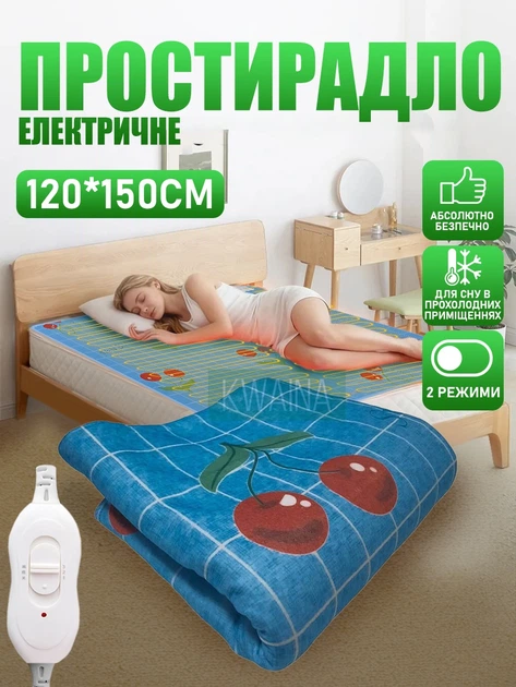 Електропростирадло 220V з підігрівом 150х120см електрична ковдра-покривало в смужку, плюш "синя клітина вишня" для сну та об
