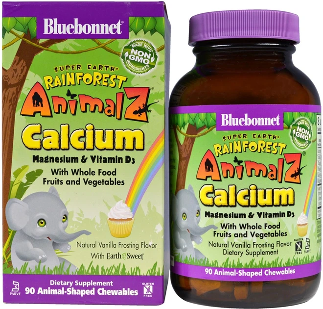 Кальцій магній та вітамін D3 Ваніль мінерали Bluebonnet Nutrition Rainforest Animalz 90 жувальних таблеток (743715001961)