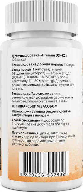 Вітамін D3+K2 Biotus 5000 МО/50 мкг 120 капсул (BIO-532092)
