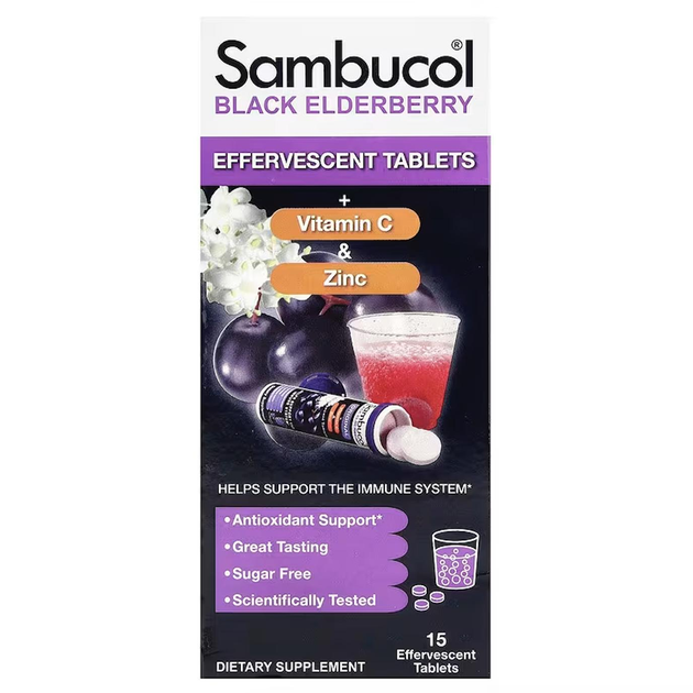 Чорна бузина, шипучі таблетки з вітаміном C та цинком, Sambucol, для дітей від 4 років, 15 шипучих таблеток