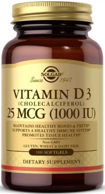 Вітамін Д3 Solgar (холекальциферол) Vitamin D3 25 мкг (1000 МО), 100 капсул (SOL-03340)