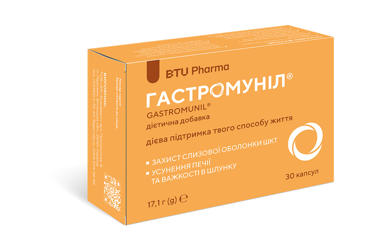 ГАСТРОМУНІЛ® для захисту слизової оболонки шлунка і кишківника. Дієтична добавка, 30 капсул