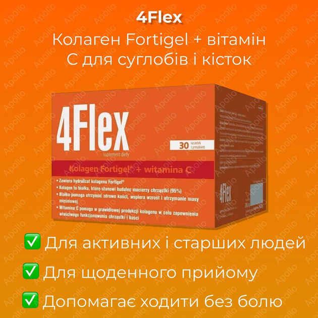 Колаген 4 Флекс для суглобів, хрящів, кісток з вітаміном C , 4Flex Active Kolagen Fortigel + vitamin C, 30 саше