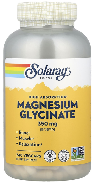 Магній гліцинат з підвищеною засвоюваністю, 350 мг, 240 капсул, здоров’я кісток, серця, нервової системи, Solaray.