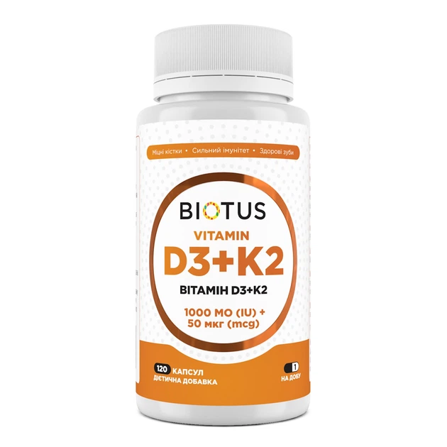 Вітамін D3+К2, Vitamin D3+K2, Biotus, 1000 МО/50 мкг, 120 капсул