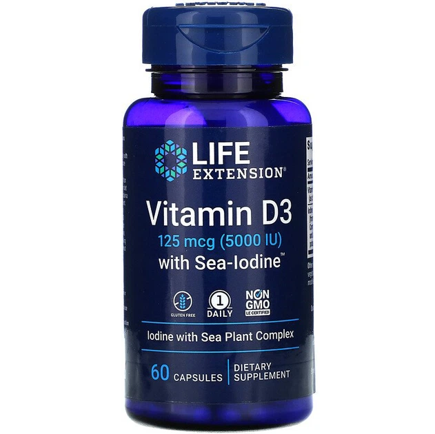 Вітамін D3 з йодом Life Extension "Vitamin D-3 with Sea-Iodine" холекальциферол Д3 з комплексом морських рослин, 125 мкг / 5