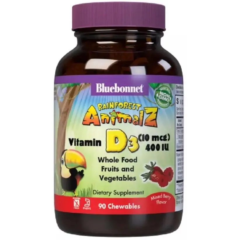 Вітамін D3 для дітей Bluebonnet Nutrition Rainforest Animalz зі смаком ягід 10 мкг 90 цукерок