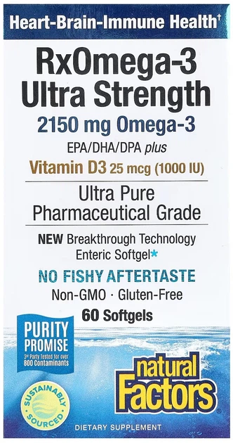 Жирні кислоти Natural Factors Омега-3 ультра та вітамін D3 2150 мг RxOmega-3 Ultra Strength with Vitamin D3 60 гелевих капсу