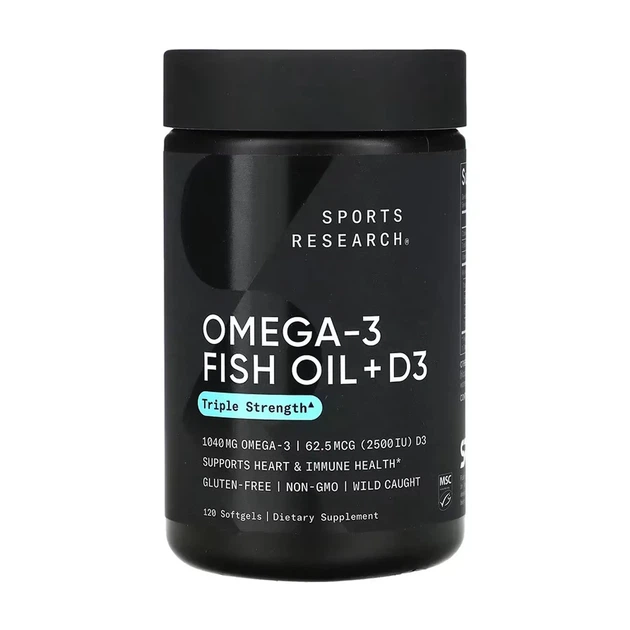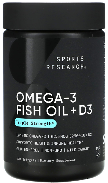 Sports Research, Омега-3, риб’ячий жир і D3, потрійна сила, 1040 мг і 62,5 мкг (2500 МО), 120 капсул