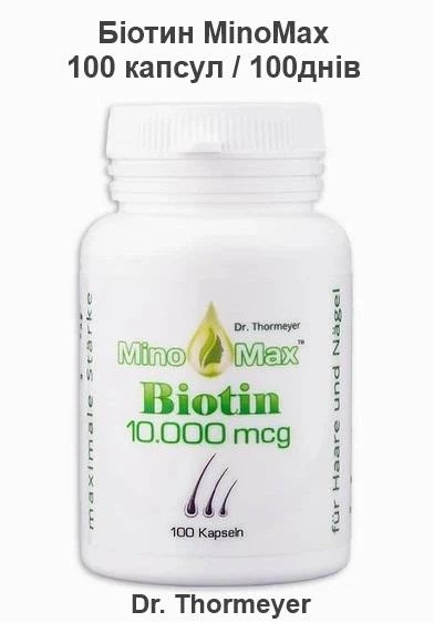 Біотин, вітамін росту волосся та поліпшення шкіри MinoMax Biotin, для жінок та чоловіків, Dr. Thormeyer 100 капсул/10000 мкг