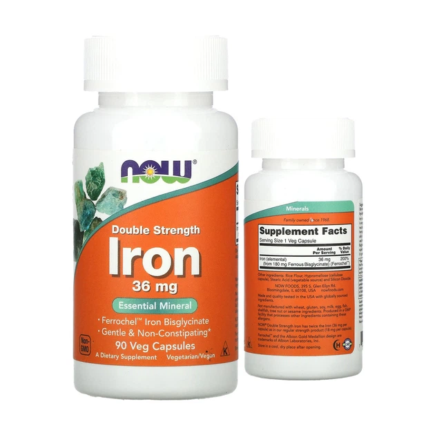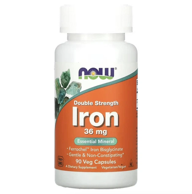 NOW Foods залізо підвійної концентрації 36 мг 90 вегетаріанських капсул iron бісгліцинату заліза для гемоглобіну харчова доб
