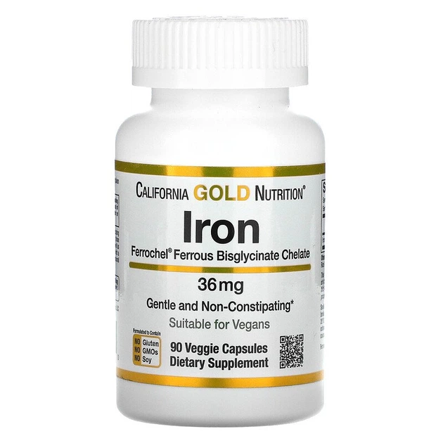 Залізо California GOLD Nutrition "Iron" бісгліцинат заліза, 36 мг (90 рослинних капсул)
