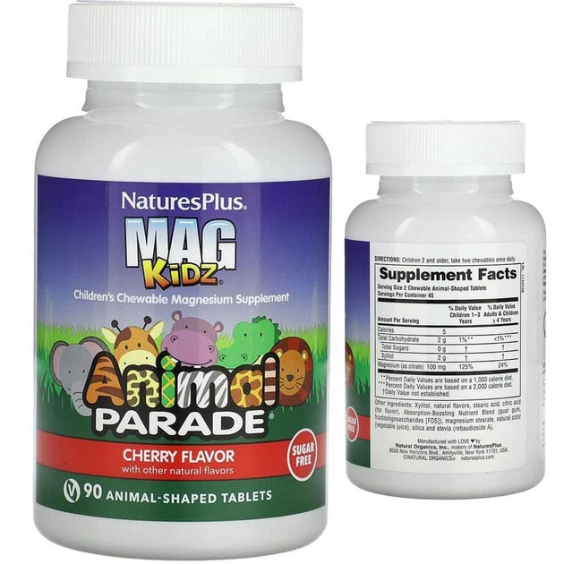 NaturesPlus MagKidz Animal Parade жувальні таблетки з магнієм для дітей вишня 90 таблеток у формі тварин вітамін магній