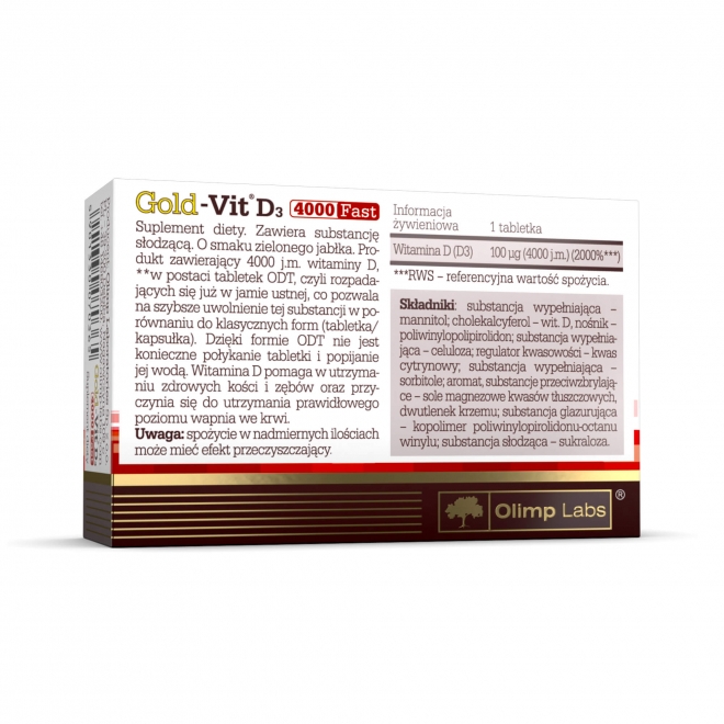 OLIMP Gold-Vit D3 4000 fast - добавка холекальциферолу (вітаміну D3) у формі таблеток, що легко розсмоктуються. Розроблена спеціально для тих, хто не любить ковтати пігулки та капсули. Особливості: - Допомагає підтримувати здоров'я кісток та зубів - Сприяє підтримці нормального рівня кальцію в крові - Підтримує правильне засвоєння та використання кальцію та фосфору - Позитивно